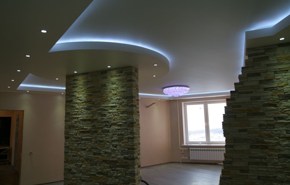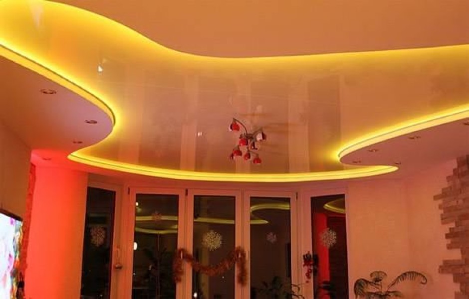 Сочетание многоуровневых конструкций с изгибами, а также подсветки, способно преобразить дизайн любого интерьера.