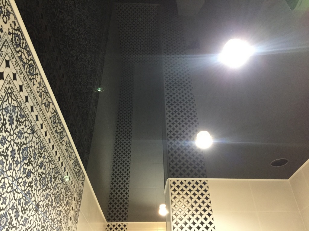 Чёрный цвет всегда был символом элегантности и роскоши. Он привлекает внимание и создает эффектный контраст с другими цветами. Чёрные глянцевые натяжные потолки — это не только красиво, но и практично. Они устойчивы к пыли, грязи и влаге, поэтому идеально подходят для помещений с высокой влажностью, таких как ванные комнаты и кухни.