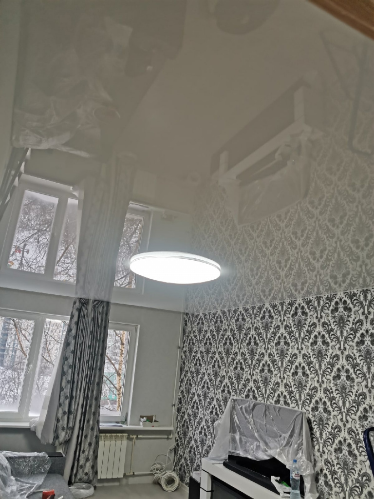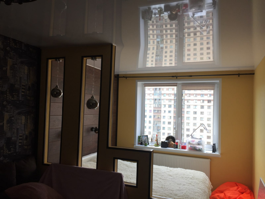 Это настолько гладкий материал, что он фактически отзеркаливает пространство, тем самым увеличивая его объёмы. Это свойство меняется в зависимости от цвета полотна. Если вы хотите, чтобы отражение было минимальным, то делайте выбор в пользу светлых тонов – в них будут видны лишь размытые контуры помещения. Если же, наоборот, вы любите зеркала, то подбирайте тёмные тона.