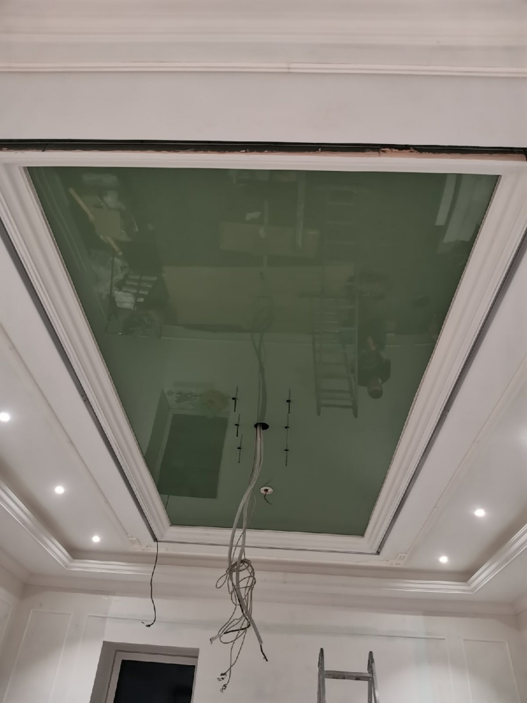 Чёрный натяжной потолок выглядит как зеркало, в котором можно разглядеть мелкие детали.