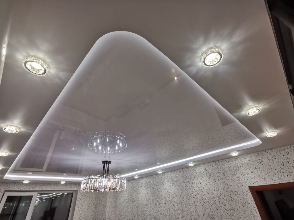 Глянцевый натяжной потолок является универсальным и с точки зрения освещения. Что бы вы не выбрали – всё будет смотреться идеально. Единственное на что стоит обратить внимание, это на цвет осветительных приборов. Он должен соответствовать оттенку полотна. В остальном, рекомендации такие же, как и для любых других видов полотен: