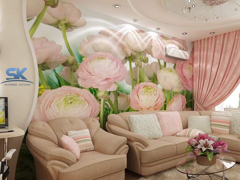 С точки зрения внешнего вида, равного разнообразия эстетики не предоставит ни один отделочный материал. Индивидуальность оформления можно подчеркнуть блеском глянца, перламутровостью сатина или классикой матовой фактуры. Цвет широчайшей гаммы, комбинации цветов – всё доступно, когда на стене у нас – натяжные потолки. Обои на стену, даже с приставкой «фото-» никогда не дадут такого визуального качества, хотя бы уже потому, что неизбежно наличие швов. Сколь бы незаметны они были, они – будут, а ПВХ-плёнка на всю поверхность стены может быть изготовлена одним полотном.