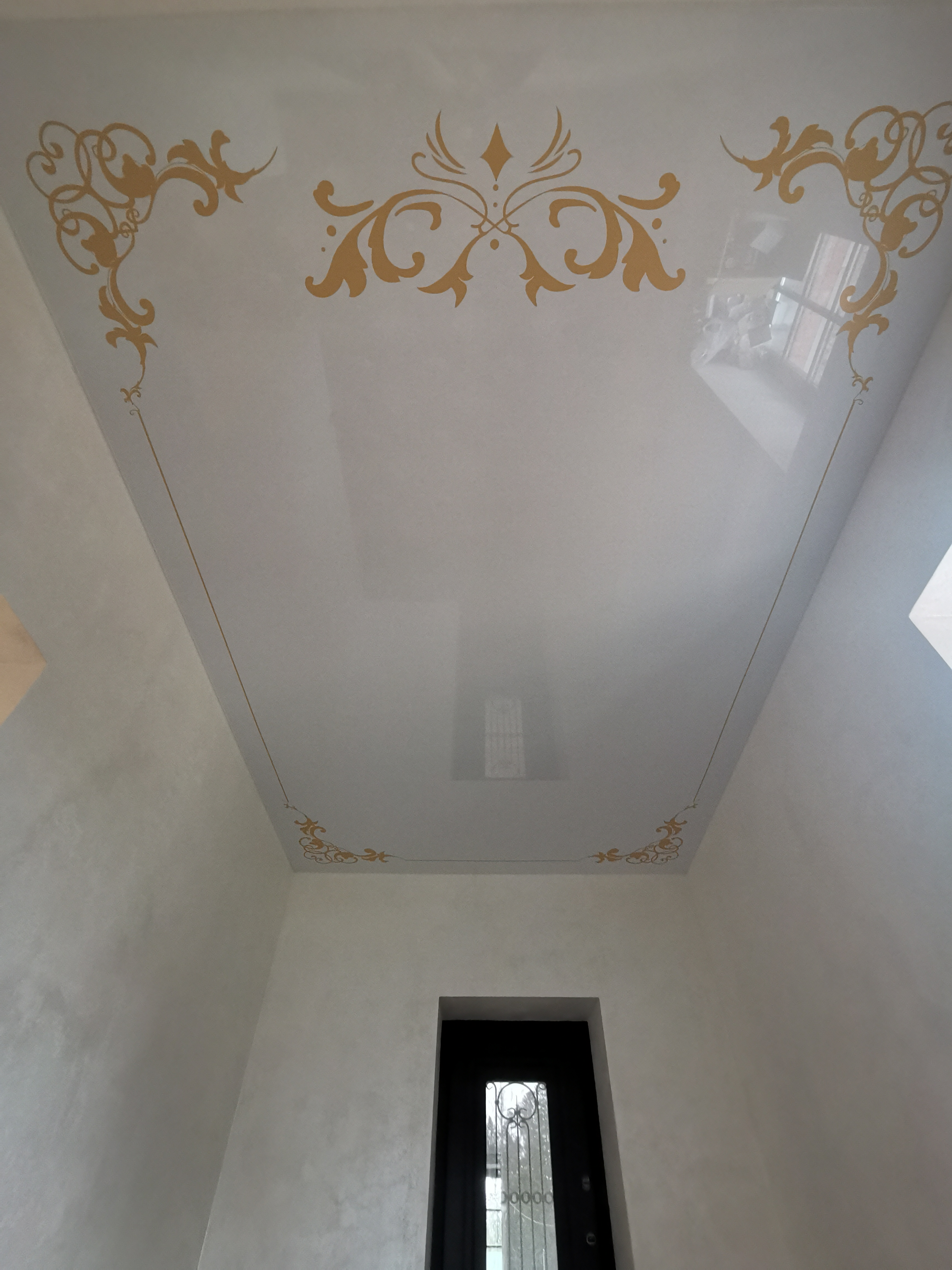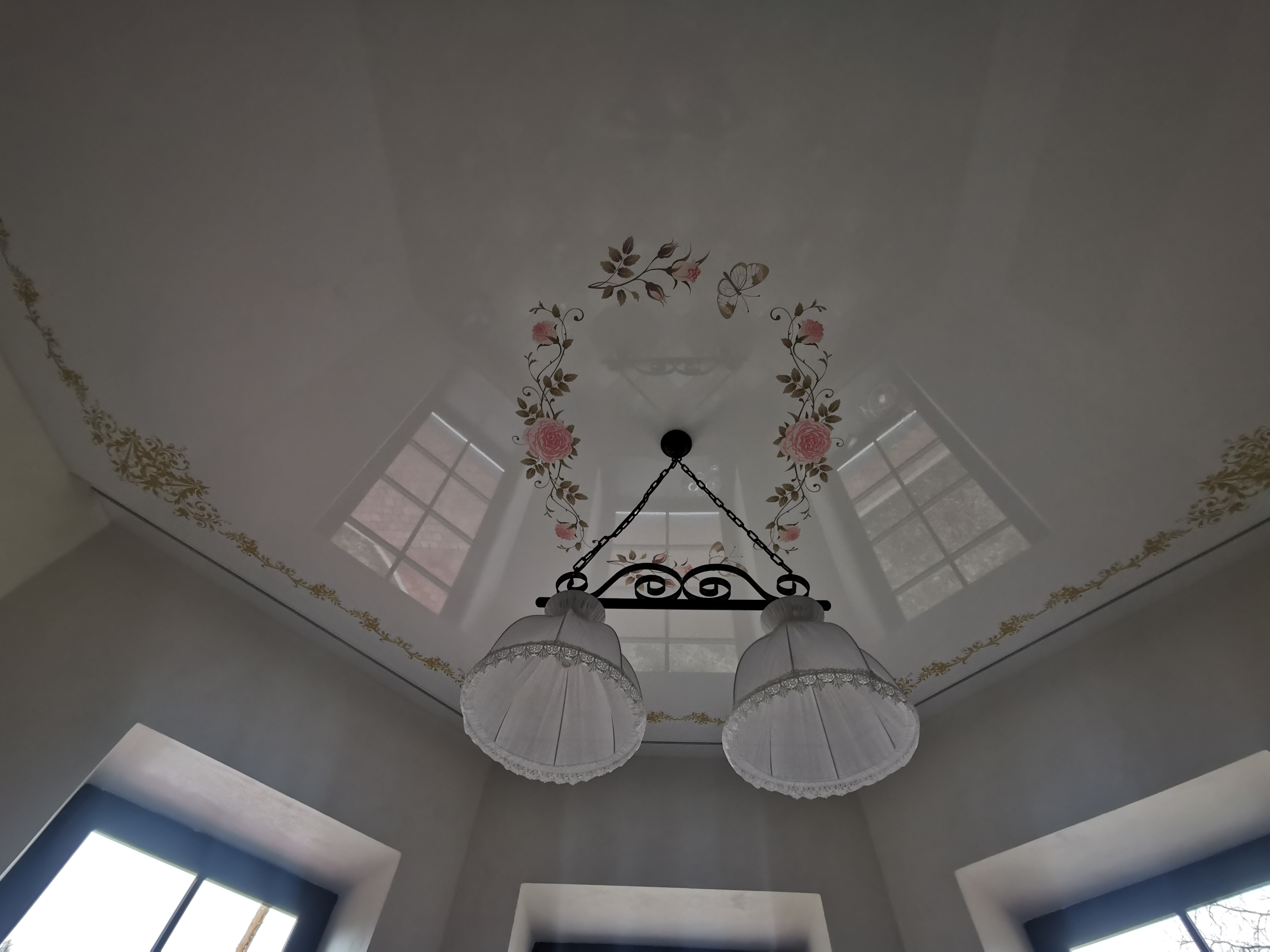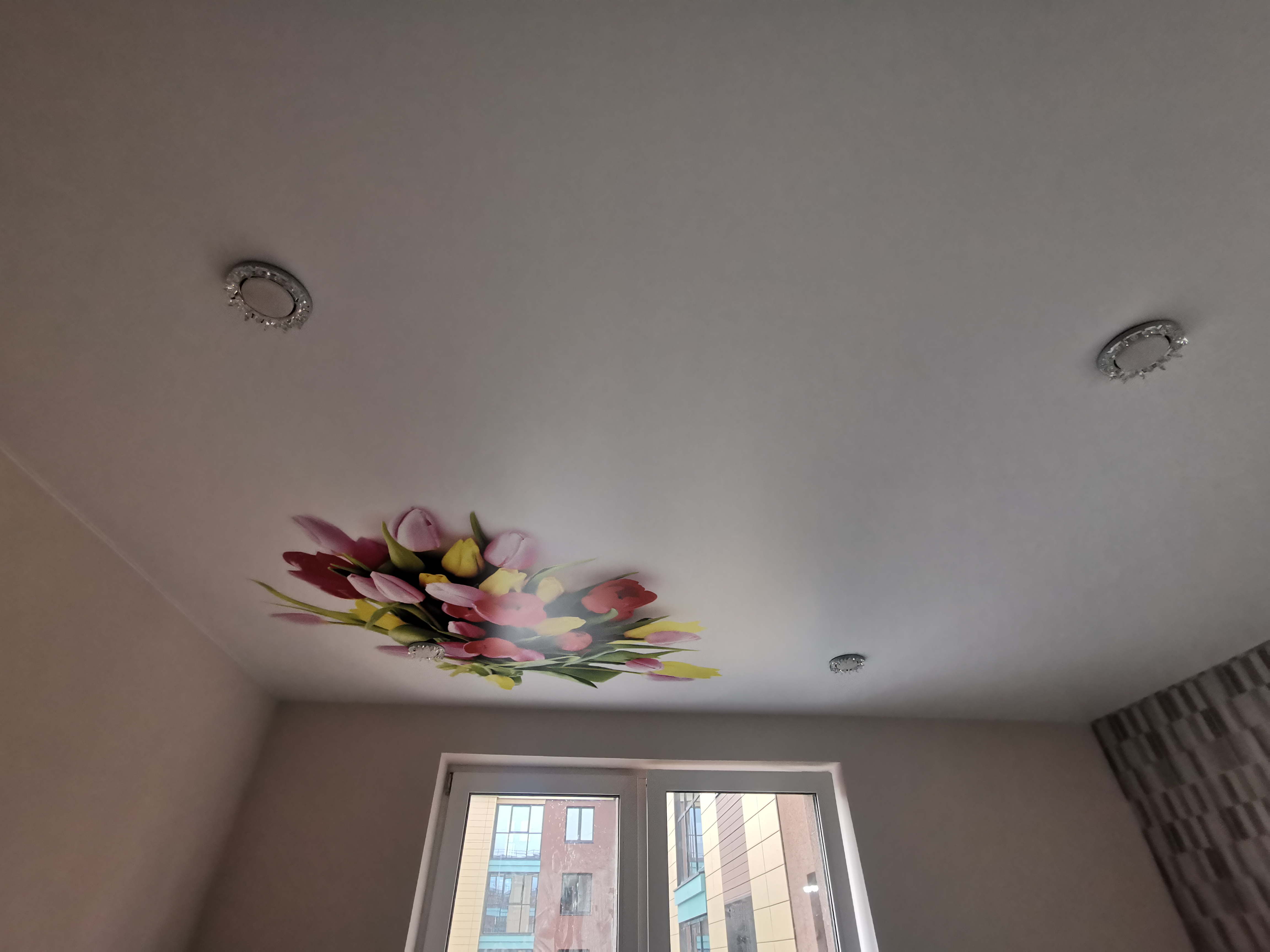 Натяжной потолок с фотопечатью помогает создать интересный и живой интерьер, наполнив помещение яркими красками. Для нанесения на бесшовное полотно можно подобрать любой рисунок — от абстрактных узоров до репродукций известных картин. Таким образом удается добиться уникальности в оформлении потолочного пространства без скрадывания высоты.