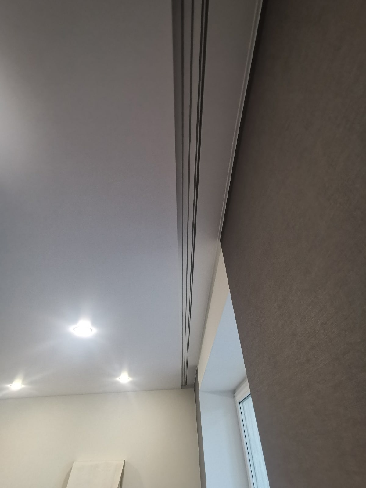 Профиль ПК-5 – это наиболее сложное с технической точки зрения решение, но результат прекрасно смотрится и не требует дополнительной отделки. Профиль включает в себя крепление для потолка с двух сторон и полозья для штор. Фактически, это адаптированный под натяжной потолок карниз.