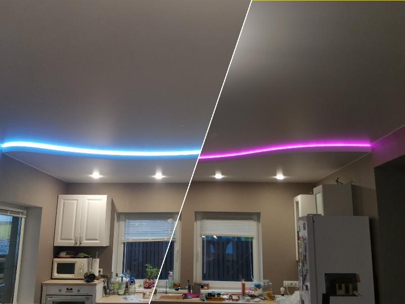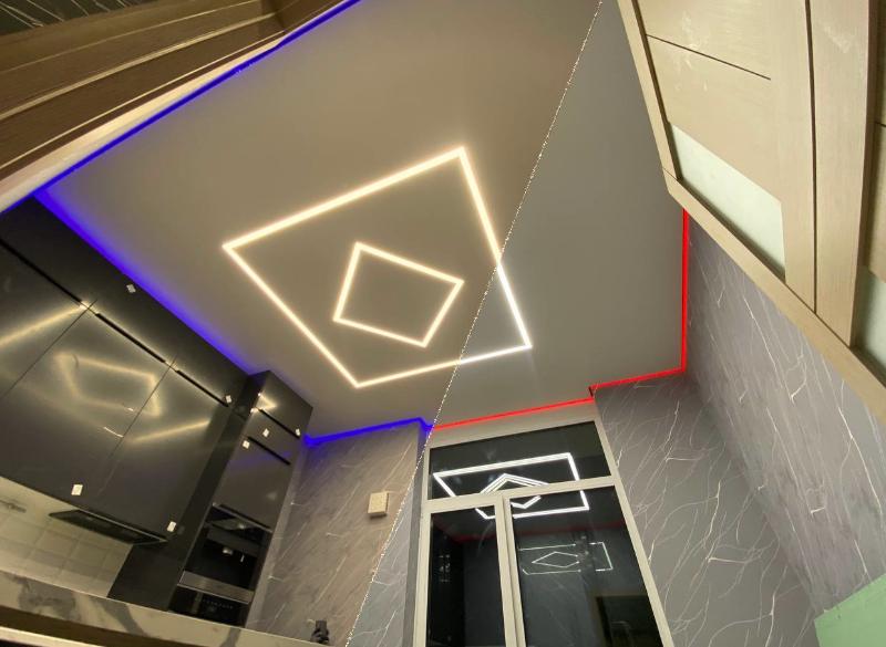Как правило, это недешёвый вариант конструкции. И связано это не сколько со стоимостью самой ленты, столько с используемыми технологиями установки самого натяжного потолка. Куда бы вы не устанавливали ленту, всегда потребуются дополнительные конструкции — специальные потолочные багеты, корпуса для LED-ленты, карнизы и переходы от одного уровня к другому. Конечно, можно просто протянуть ленту поверх полотна после установки, но такой подход не позволит достичь wow-эффекта.