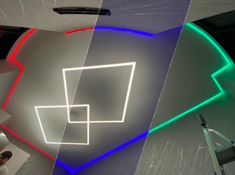 Здесь нужно руководствоваться практической пользой и внешним видом. Если от LED-ленты требуются осветительные свойства, то рекомендуем смотреть в сторону световых или контурных линий белого цвета. Если же требуется вечерняя подсветка, то можно создать парящий эффект для одного или нескольких уровней потолка.