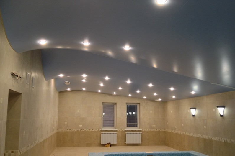 При создании волнообразных натяжных потолков распространена практика сочетания различных цветов и фактур, однако важно правильно отнестись к высоте волны. Все дело в том, что такое покрытие рекомендовано для высоких помещений, иначе волнистый дизайн будет скрадывать полезное пространство комнаты. Помните, что при установке натяжного потолка вы ограничены лишь общей сочетаемостью его дизайна с дизайном интерьера, поэтому может выбирать различные осветительные приборы, а также наносить фотопечать или даже организовывать многоуровневые конструкции. Подробнее про тип конструкций мы расскажем далее.