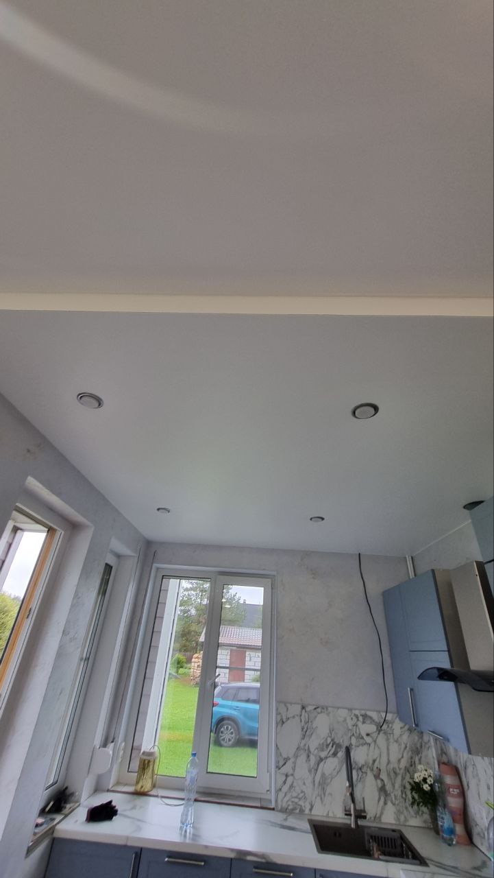 В частном доме в посёлке Донцо выполнен проект по установке натяжных потолков на площади 34 м². В работе использовалось белое матовое полотно M01, как стандартной ширины, так и шириной 500 см для бесшовной установки в большой комнате.