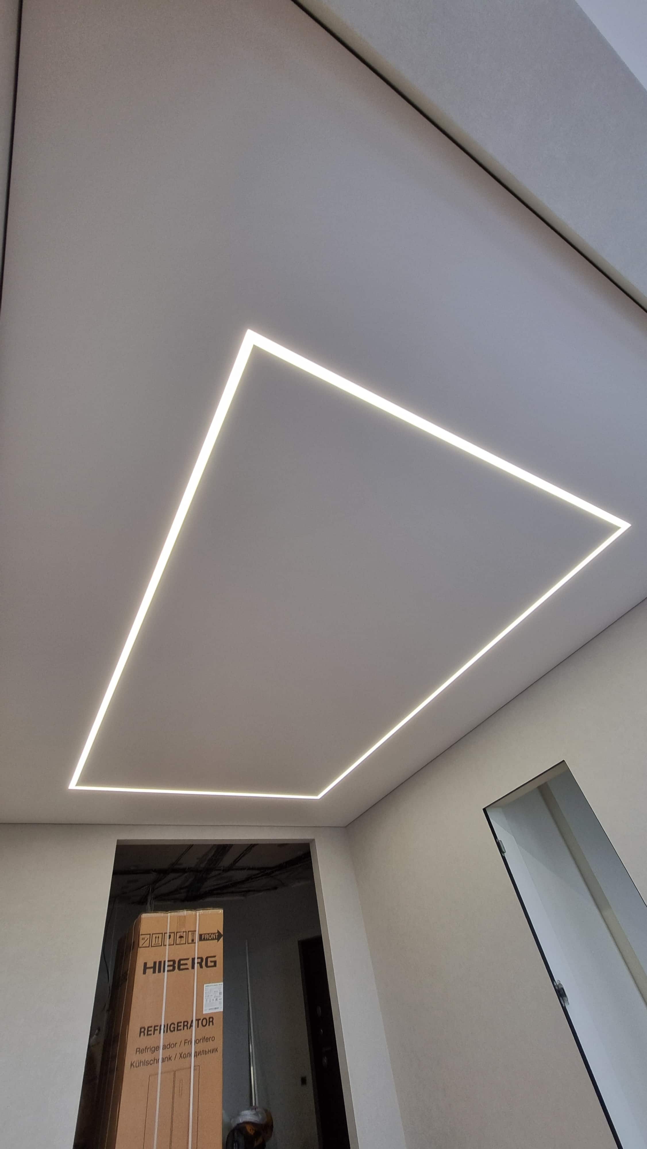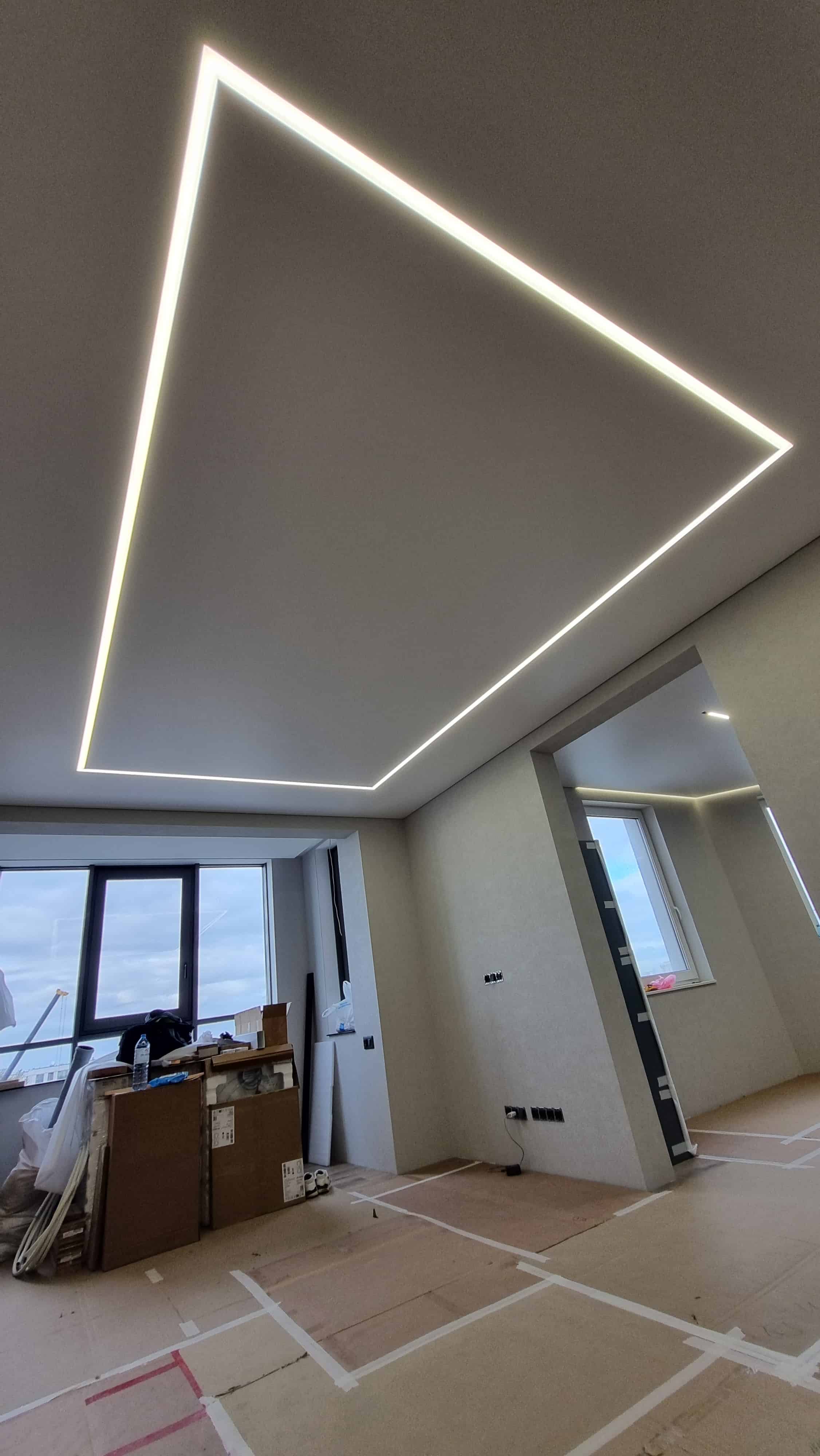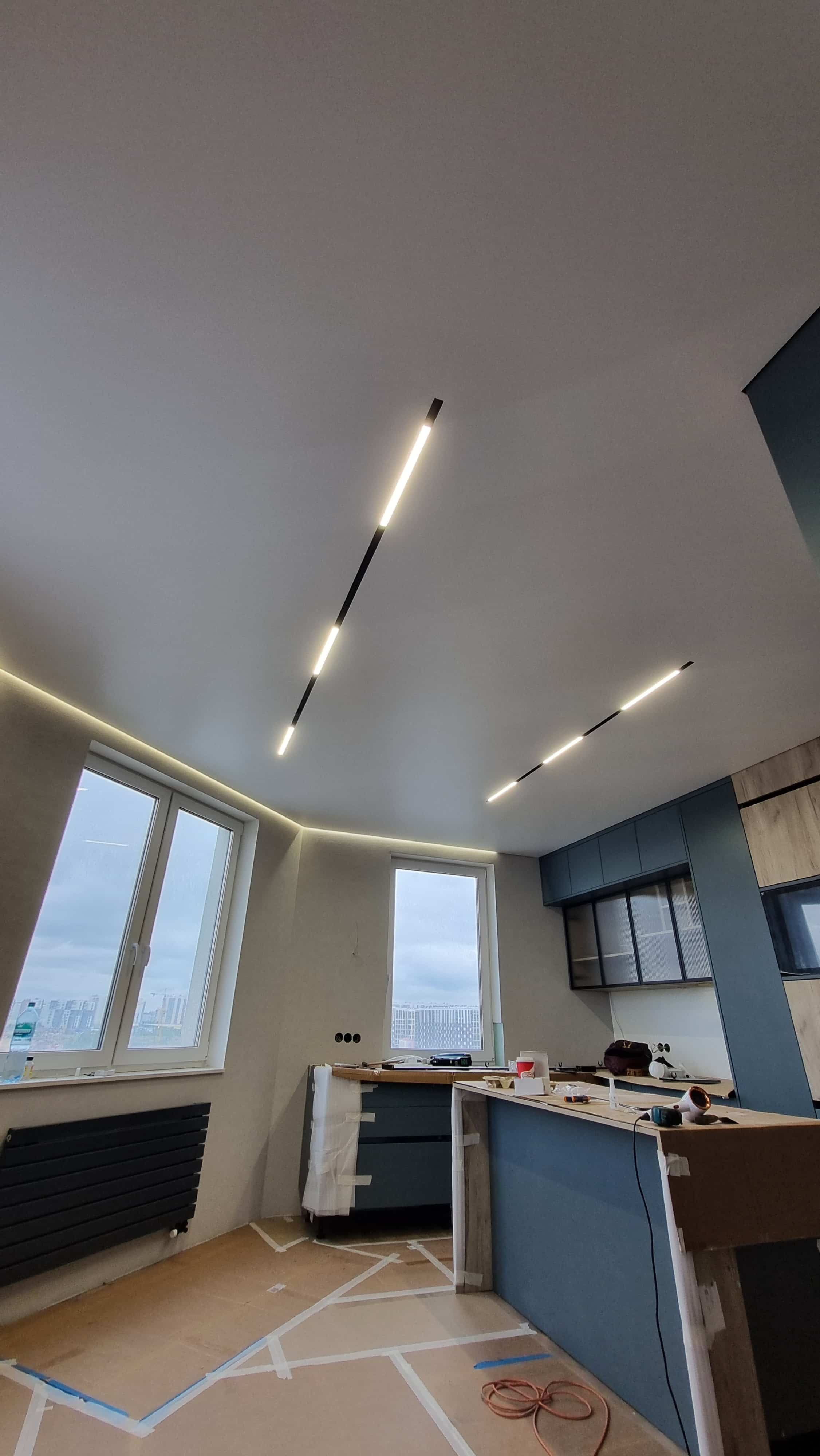 Для равномерного освещения использовалась диодная лента 4000К (12 п.м.) и белая лента (6 п.м.), управляемые блоками питания на 150 Вт и 1000 Вт. Также была выполнена обработка углов, установка декоративных элементов и монтаж парящего профиля (6 п.м.).