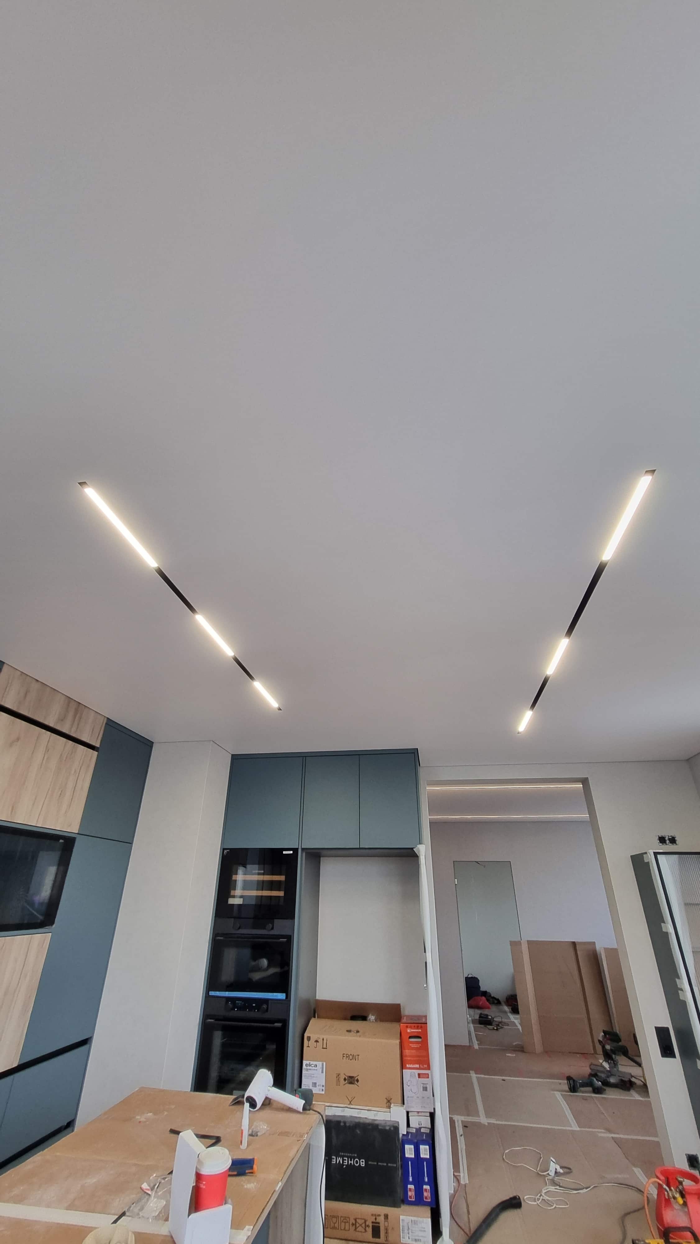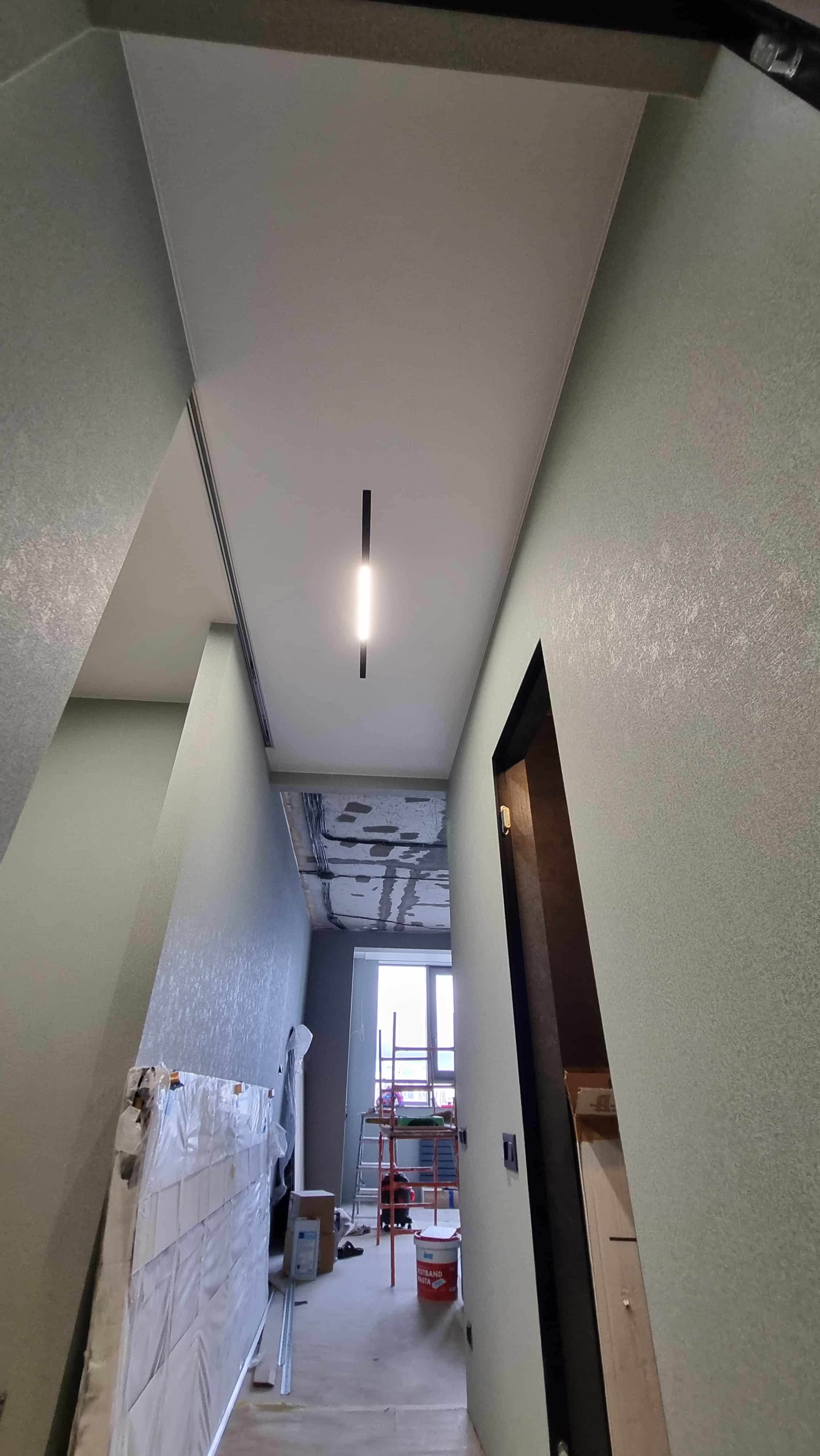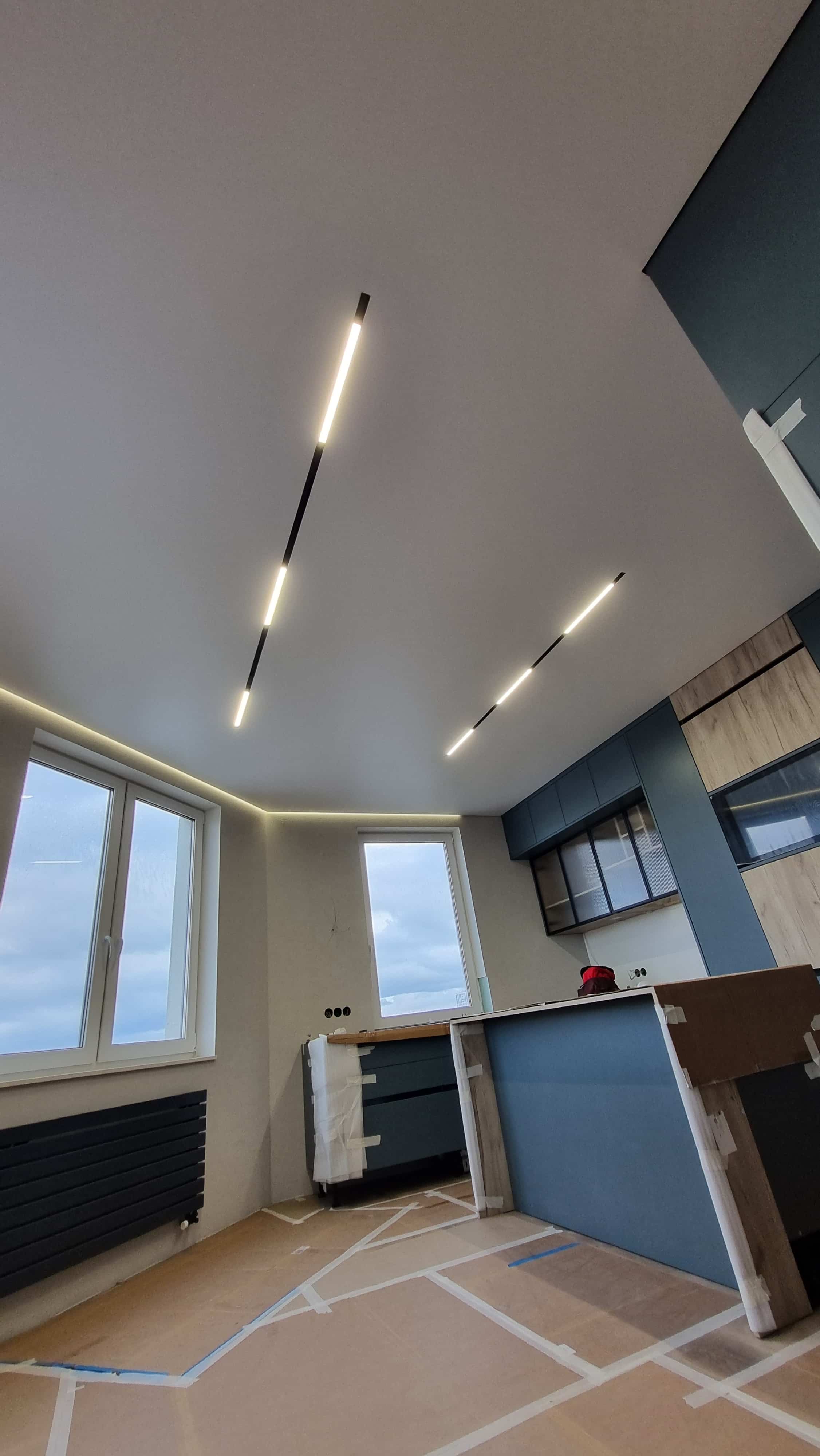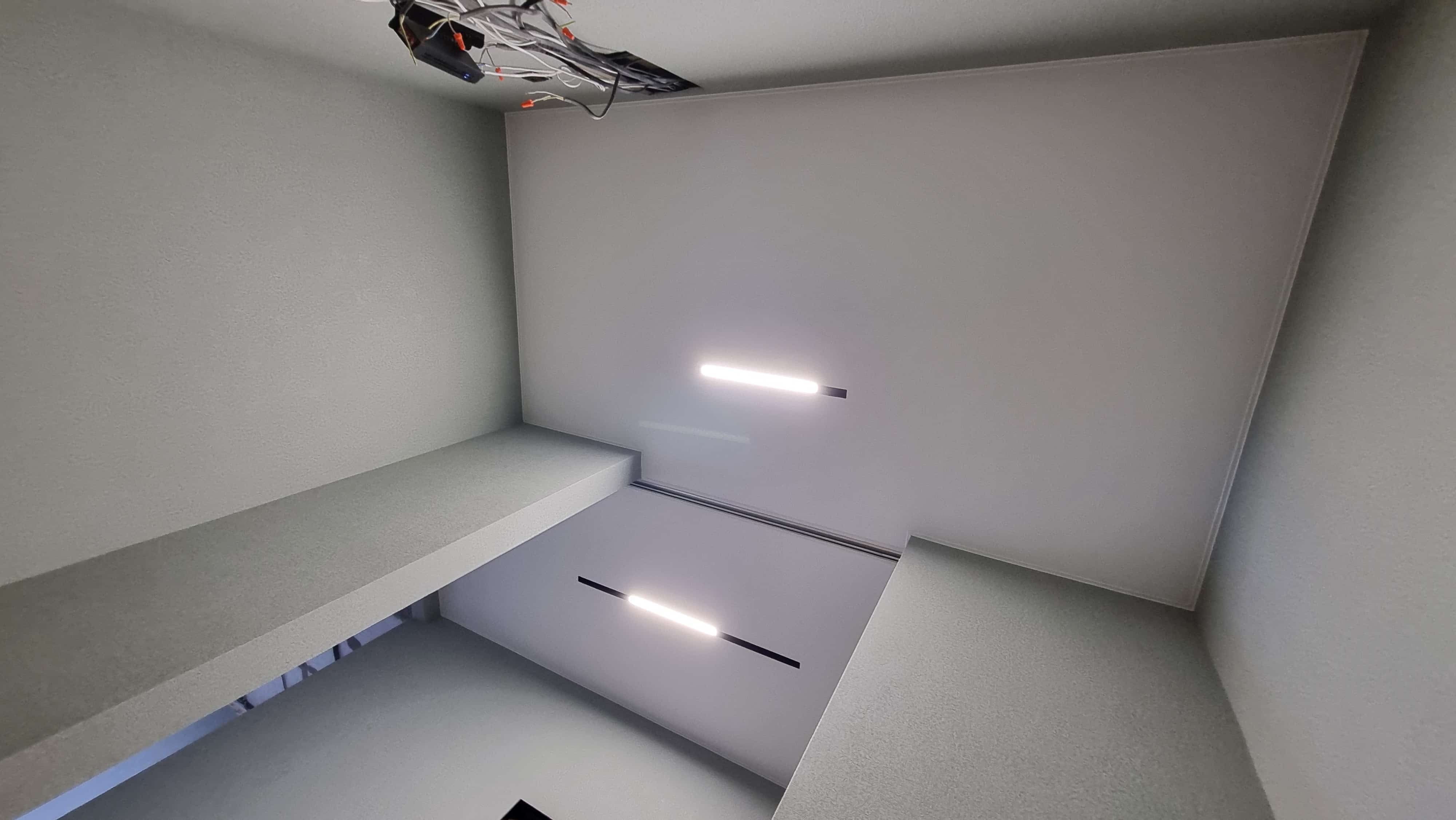 Для равномерного освещения использовалась диодная лента 4000К (12 п.м.) и белая лента (6 п.м.), управляемые блоками питания на 150 Вт и 1000 Вт. Также была выполнена обработка углов, установка декоративных элементов и монтаж парящего профиля (6 п.м.).